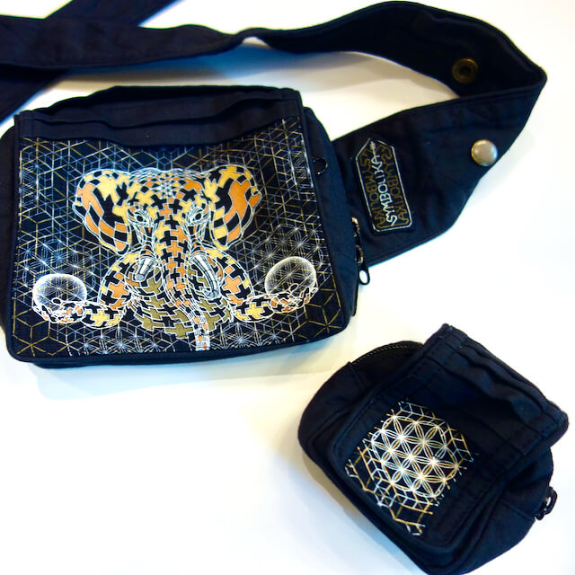 Die Trance Elefant Gürteltasche ist ein wahres Platzwunder und super praktisch! Sie hat ein mit Zippverschluss verschließbares Hauptfach, sowie mit Zipp oder Klett verschließbare Innen- und Außenfächer. Der Gürtel selbst sowie die Klappe des Hauptfaches ist mit Klettverschluss zu verschließen. Das kleine seitliche Täschchen der Trance Elefant Gürteltasche ist abnehmbar und mittels Druckknopf an zwei Stellen fixierbar. Es ist mit der Blume des Lebens bedruckt, hat Klett- und Zippverschluss und ein raffiniertes kleines Geheimfach.