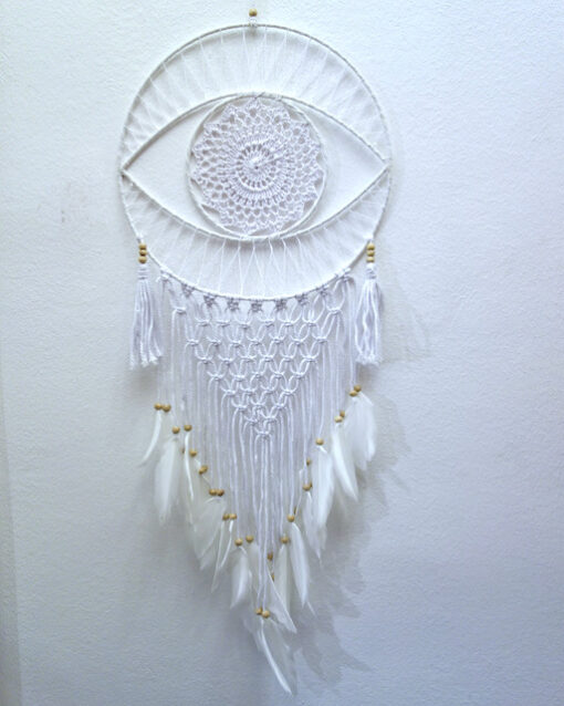 Der Traumfänger hat ein gehäkeltes Mandala in Form eines Auges im Ring, lange weiße Federn und eingearbeiteten Holzperlen. Zusätzlich ist ein wunderschönes Element in Form einer Blume des Lebens eingearbeitet. Er ist in Handarbeit in Indonesien entstanden.