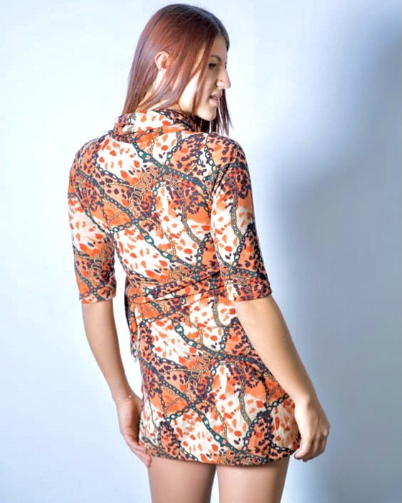 Unser Wild Chains Kleid ist ein kuscheliges Langarmwinterkleid mit 3/4 Ärmel, lockerem Kragen und seitlicher Schnürung zum Taillieren.
