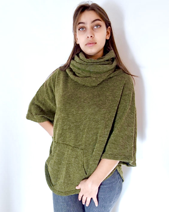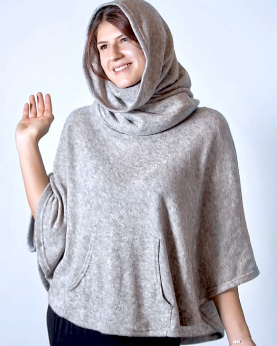 Unser Scarve Poncho ist ein kuscheliger Poncho mit langem Schalkragen/Kapuze und aufgesetzter Bauchtasche.
