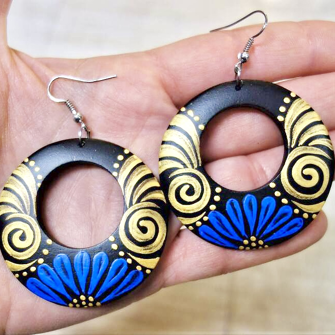 Blue Flower Ohrringe aus Holz mit blauer Blume und Spiralen